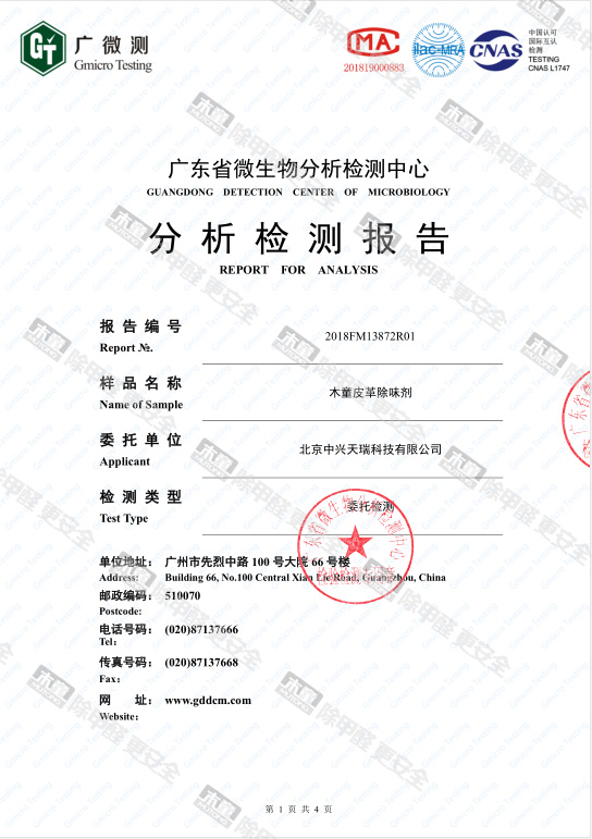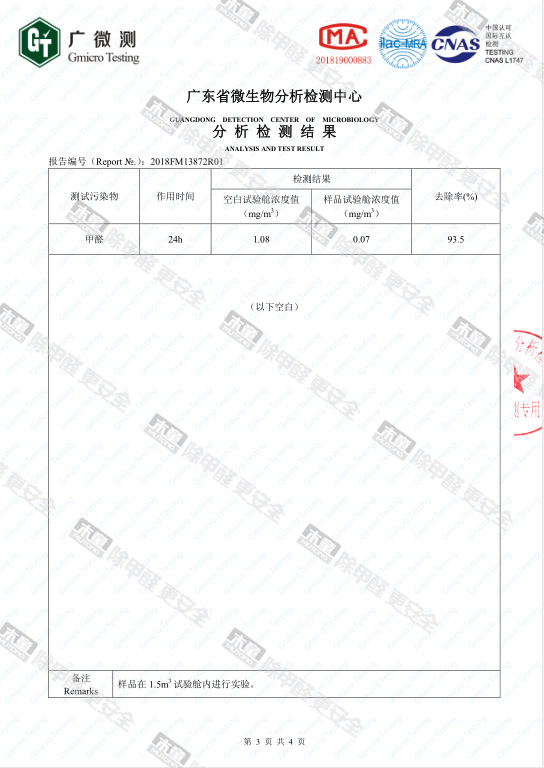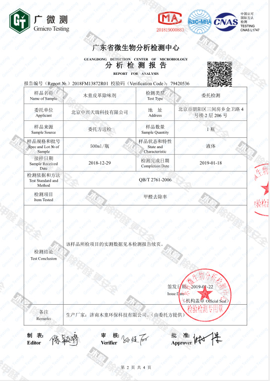 木童皮革除味劑甲醛去除率檢測報告